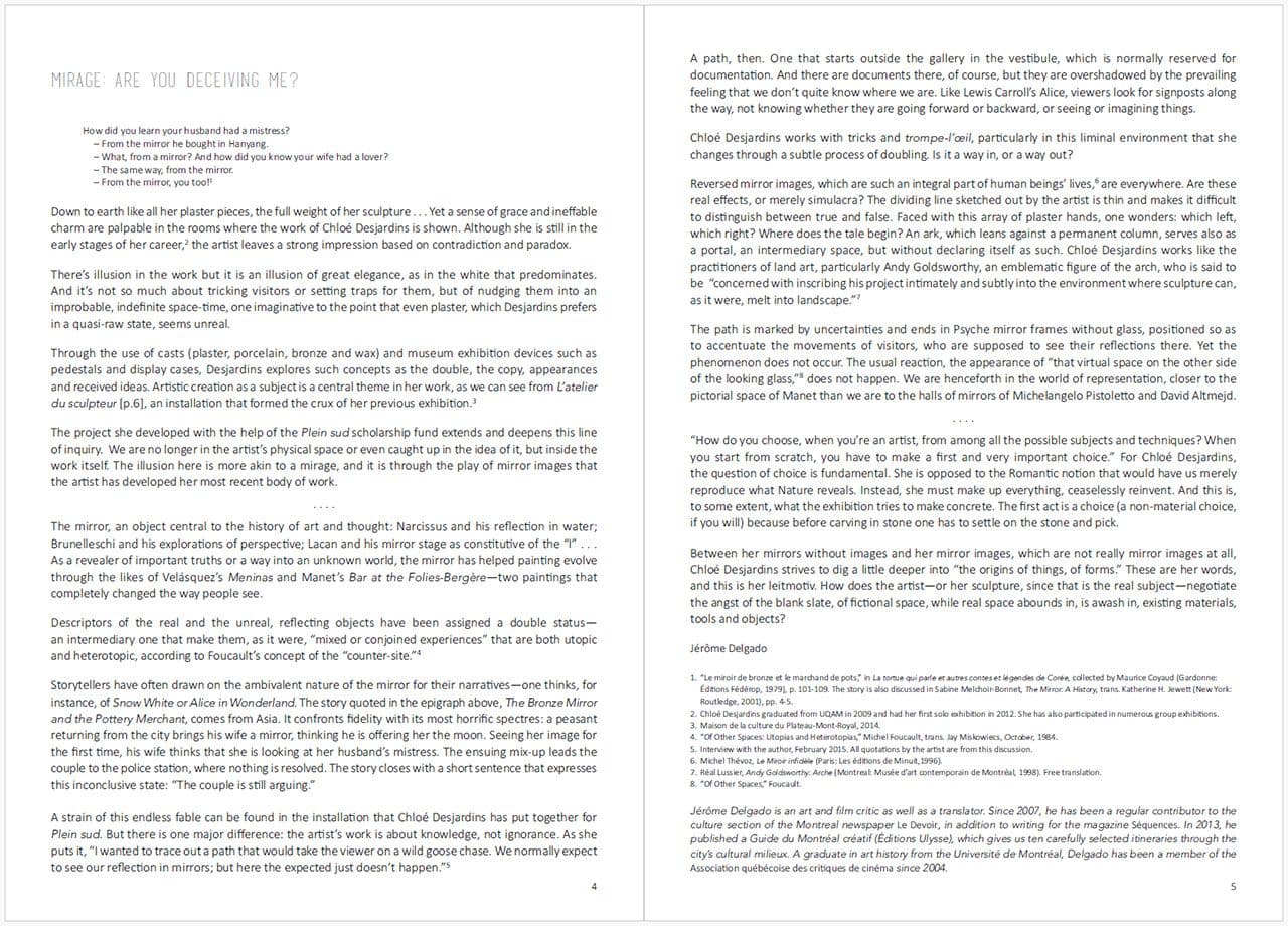 Recipient of the 2014 Plein sud honorary award, Chloe Desjardins presented the exhibition Reflexion, at Plein sud from May 23 to July 4, 2015. Text by Jérôme Delgado: “Mirage, me trompe-tu? (English translation by Donald McGrath: "Mirage: Are You Deceiving Me?"). Plein sud edition. You can get the publication here or read the text by Jérôme Delgado here.
