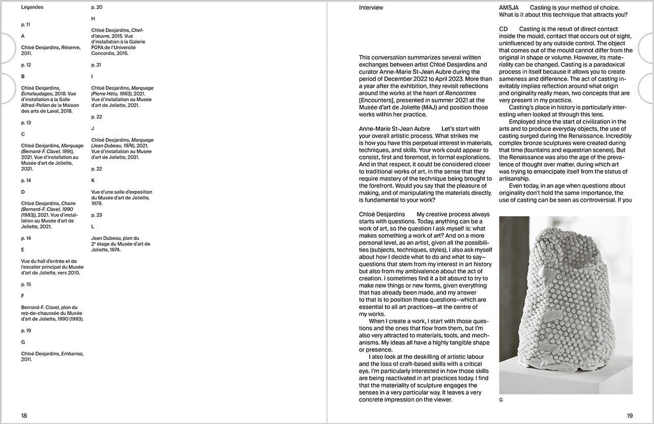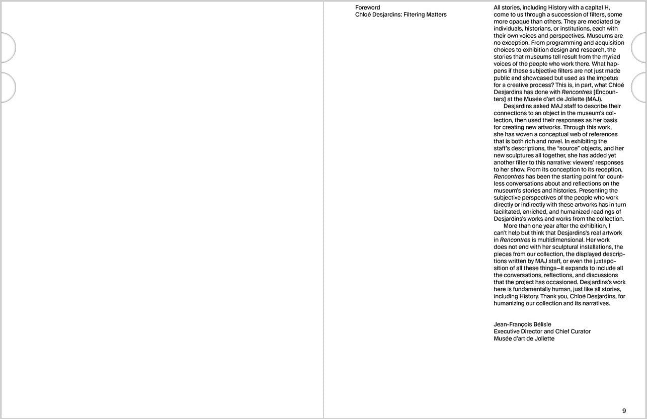 Catalog of the exhibition Encounters, presented at the Musée d’art de Joliette (MAJ) from June 19 to September 6, 2021. Chloé Desjardins asked Museum employees to describe their links with an object from the MAJ collection from which she created new works of art, thus weaving a conceptual web of referents that is both rich and innovative. This publication brings together an essay by Patrice Loubier, an interview between Chloé Desjardins and curator Anne-Marie Saint-Jean Aubre, exhibition views and all the documents associated with the project presented at the Musée d’art de Joliette in 2021. The preface is signed by Jean-François Bélisle, then director of the MAJ. The publication, composed in Switzerland Int'l and in Frame, was printed in 300 copies on Munken Lynx paper. Printing was completed on the KOPA presses in Biruliškės on behalf of the Musée d’art de Joliette. Graphic design by Zoé Brunelli, Studio de Mars. The publication is available in bookstores.