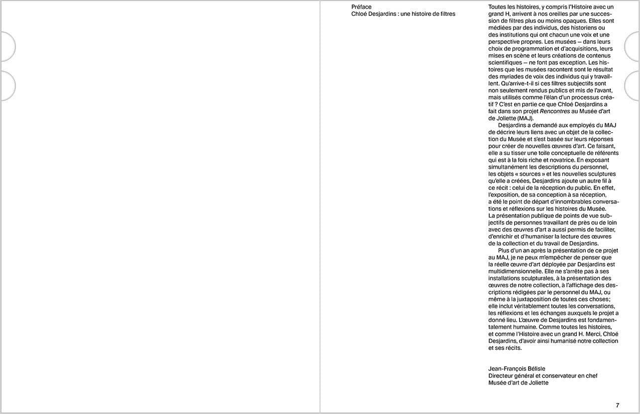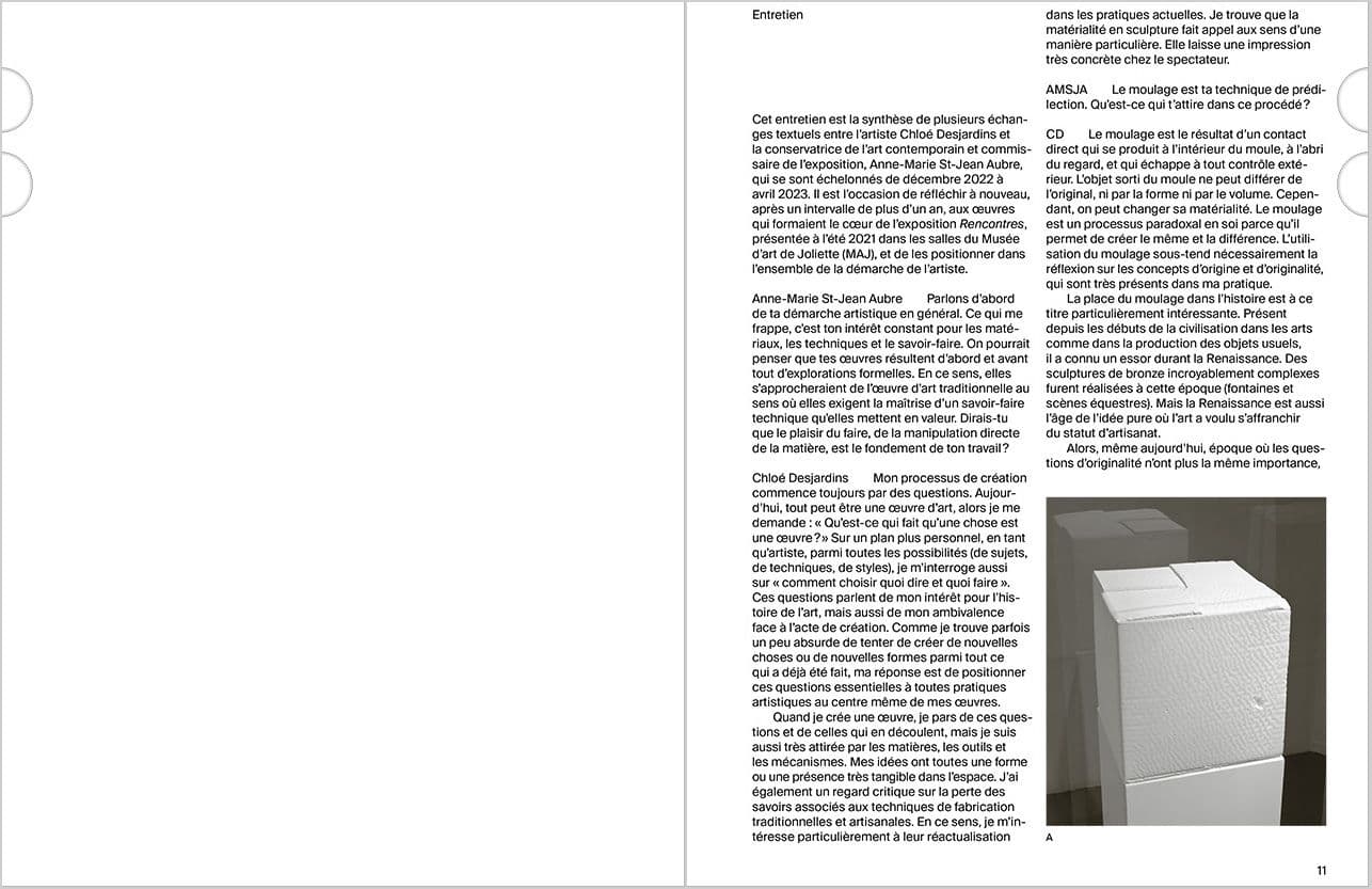 Catalogue de l’exposition Rencontres, présentée au Musée d’art de Joliette (MAJ) du 19 juin au 6 septembre 2021. L’artiste a demandé aux employés du Musée de décrire leurs liens avec un objet de la collection du MAJ et elle s’est basée sur leurs réponses pour créer de nouvelles œuvres d’art, tissant ainsi une toile conceptuelle de référents qui est à la fois riche et novatrice. Cette publication réunit un essai de Patrice Loubier, une entrevue entre Chloé Desjardins et la commissaire Anne-Marie Saint-Jean Aubre, des vues d'expositions et tous les documents associés au projet présenté au Musée d'Art de Joliette en 2021. La préface est signée par Jean-François Bélisle, alors directeur du MAJ. L’ouvrage, composé en Suisse Int’l et en Frame, a été tiré à 300 exemplaires sur papier Munken Lynx. Il a été achevé d’imprimer sur les presses de KOPA à Biruliškės pour le compte du Musée d’art de Joliette. Conception graphique par Zoé Brunelli du Studio de Mars. La publication est disponible en librairie.