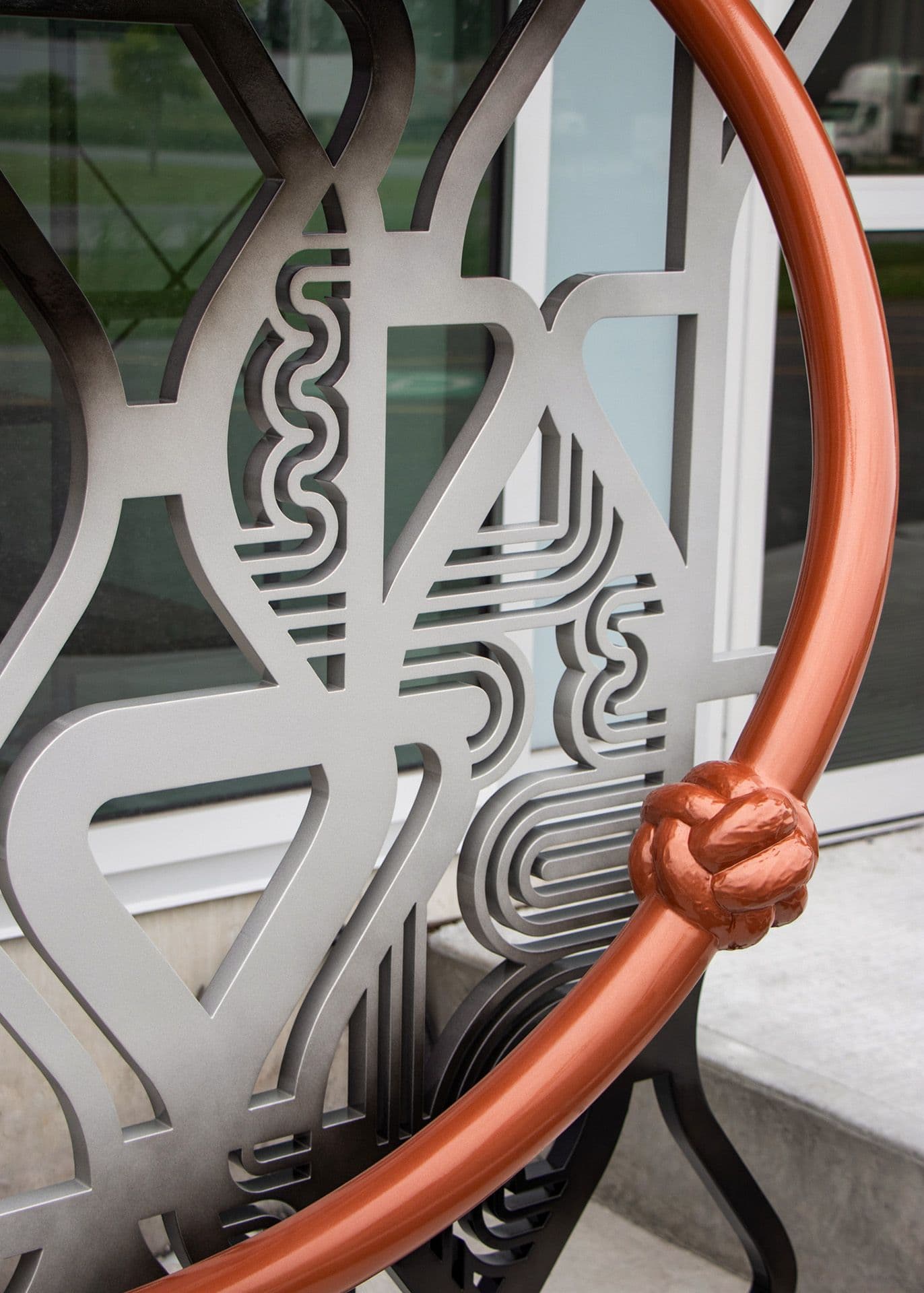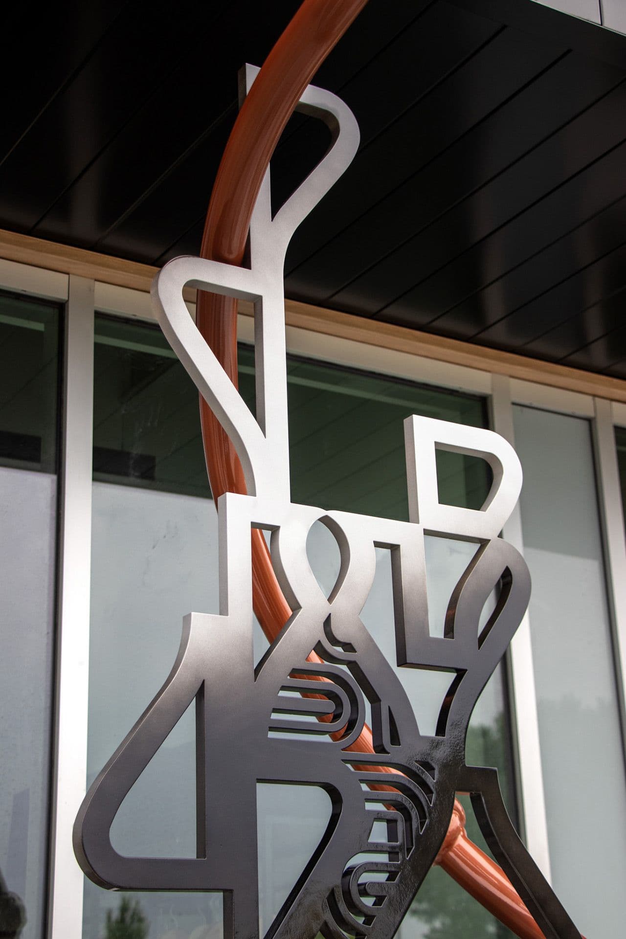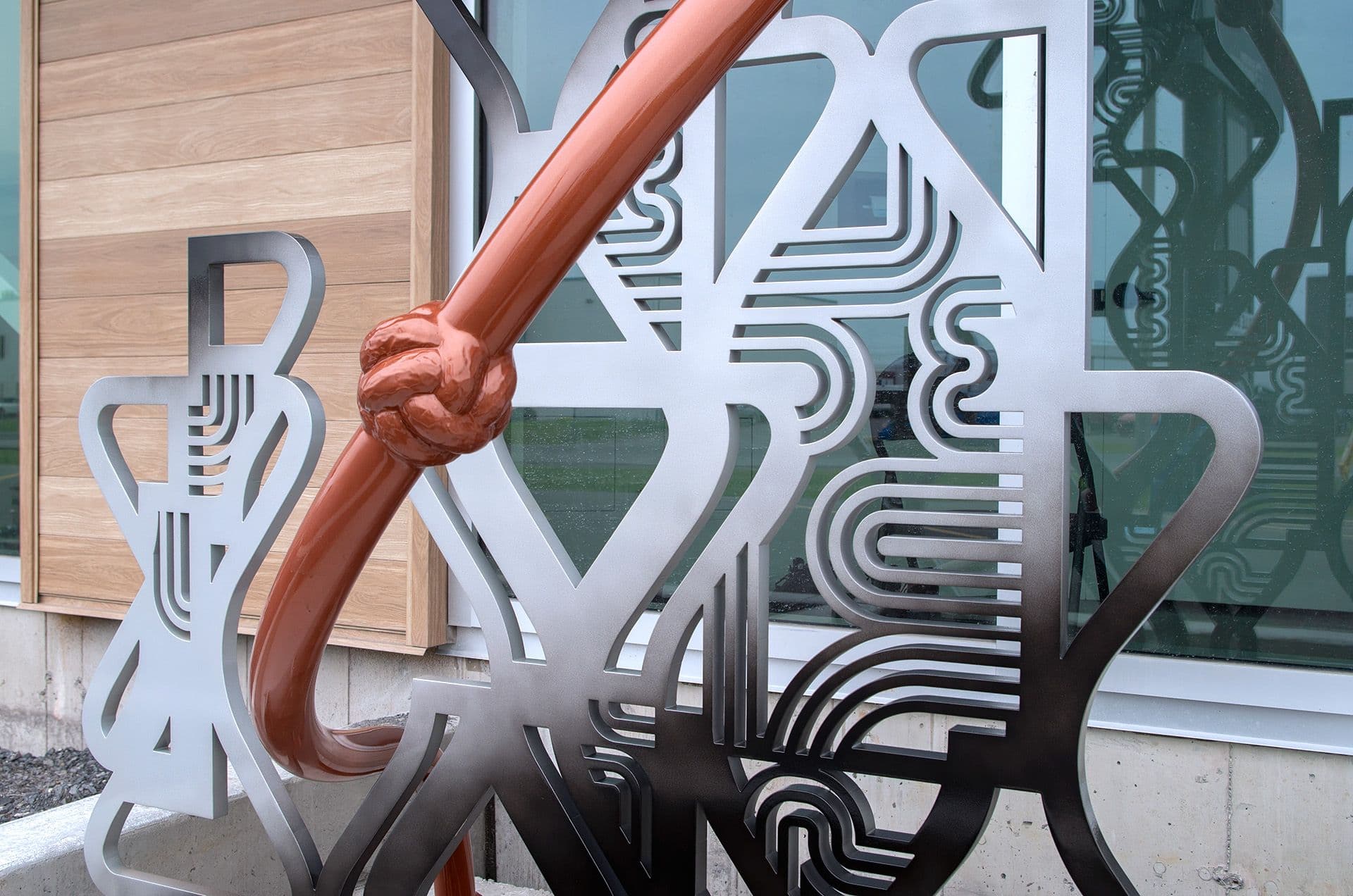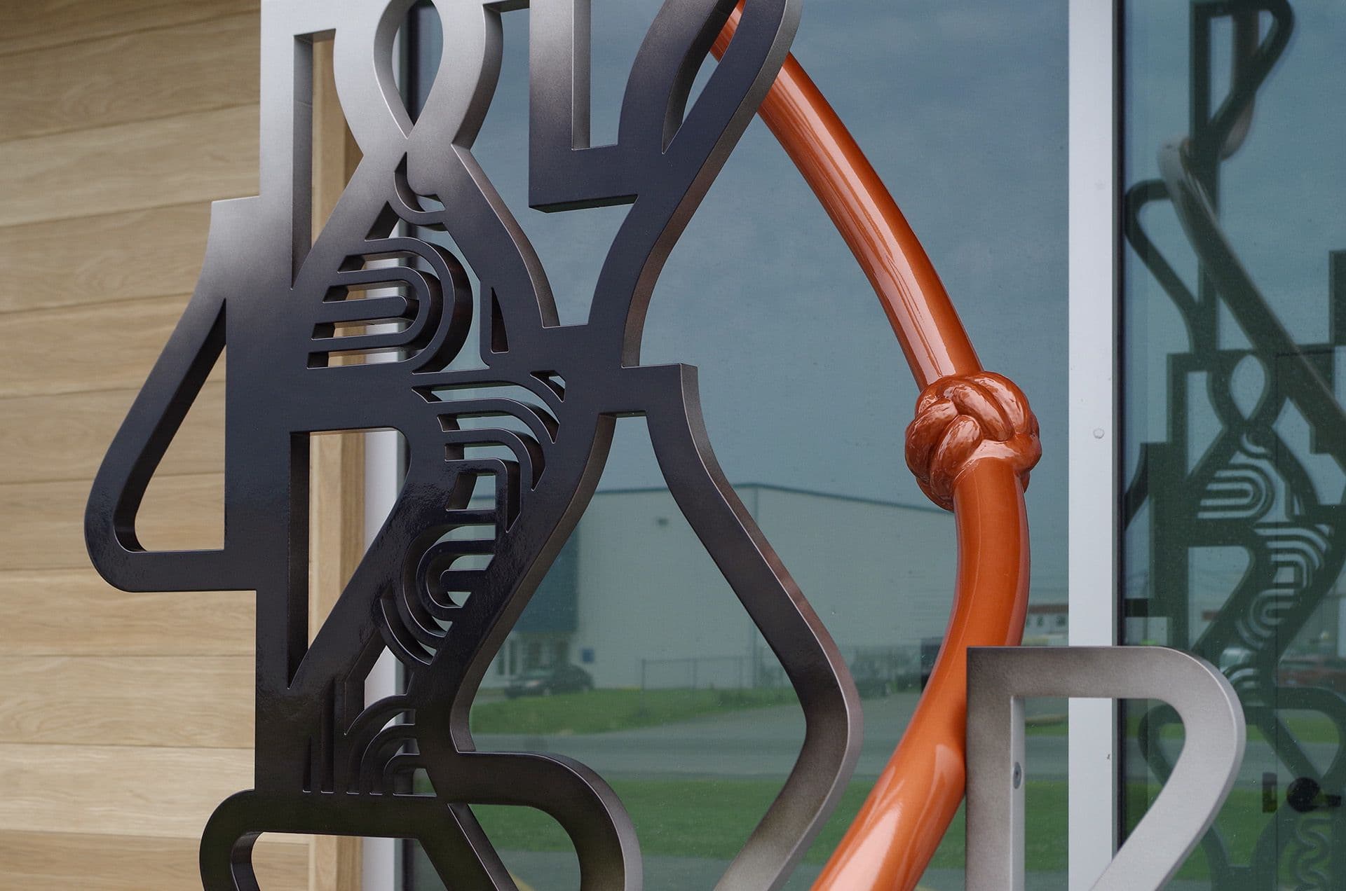 Matériaux : aluminium québécois et peinture imitant l’acier inoxydable et le cuivre Collaboration : Atelier du Bronze Lieu d’implantation : Station Agro-Biotech, Saint-Hyacinthe, Québec
